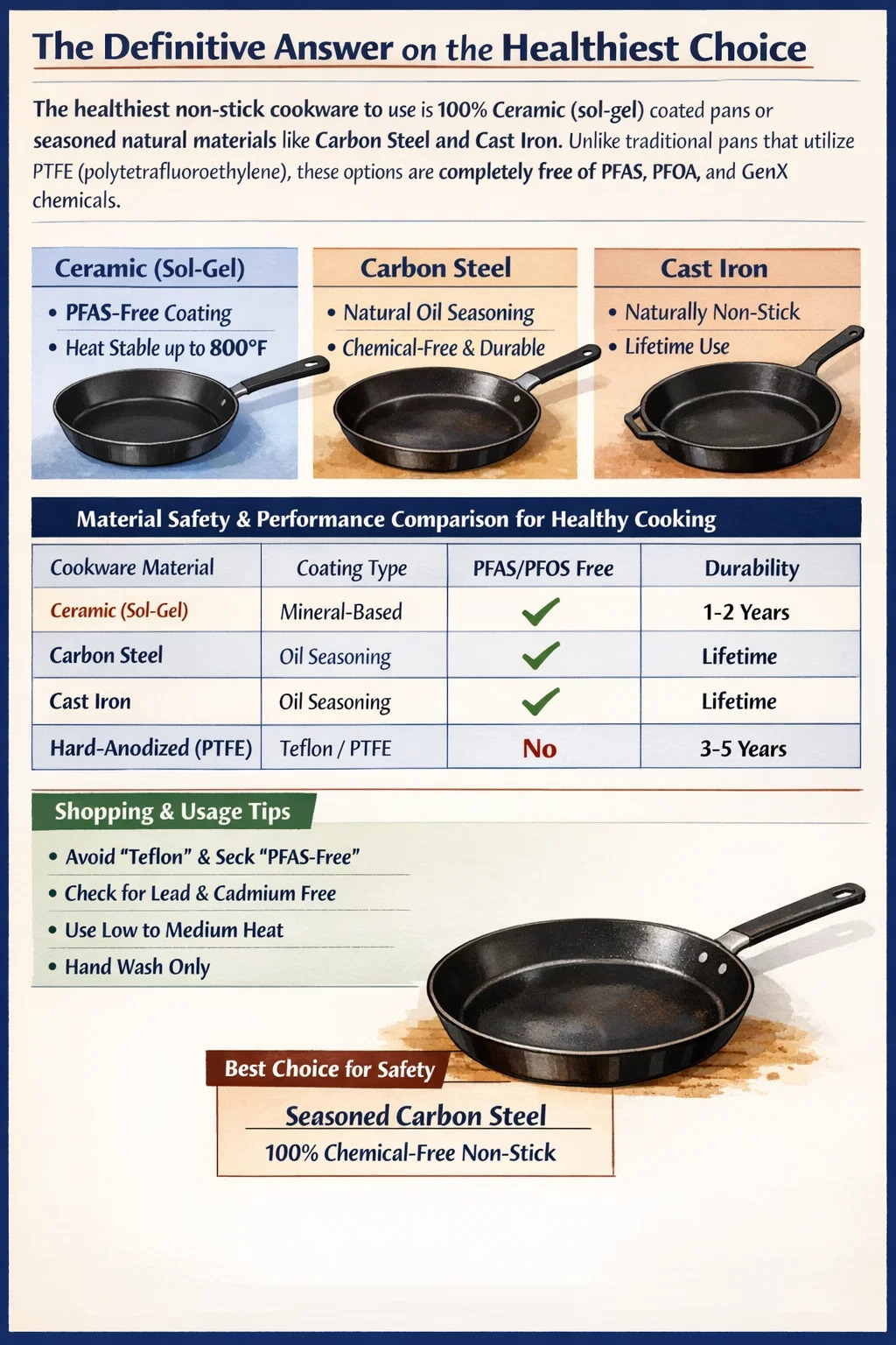 The healthiest non-stick cookware to use is 100% Ceramic (sol-gel) coated pans or seasoned natural materials like Carbon Steel and Cast Iron. Unlike traditional pans that utilize PTFE (polytetrafluoroethylene), these options are completely free of PFAS, PFOA, and GenX chemicals. For those seeking the absolute safest profile with zero chemical risk even at searing temperatures, seasoned Carbon Steel stands out as the premier choice because it creates a physical non-stick barrier using only heat and polymerized vegetable oil.